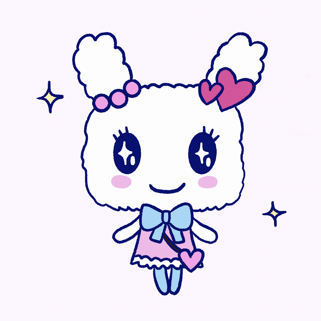 Tamagotchi character gif of Lovelitchi. One of my favorite characters, she resembles a white bunny with fluffy fur, pink cheeks, and two upright woolly ears. I love her sweet personality and sparkle in her eyes.